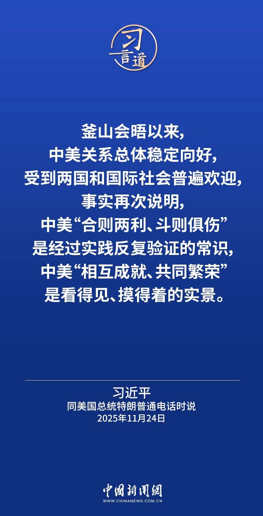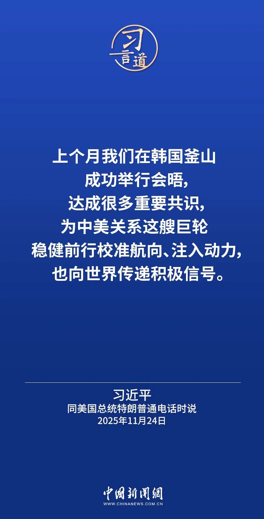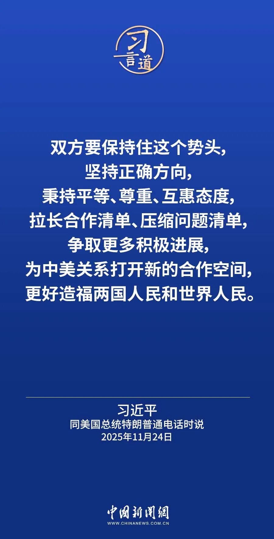 11月24日晚,國家主席習(xí)近平同美國總統(tǒng)特朗普通電話。習(xí)近平指出——