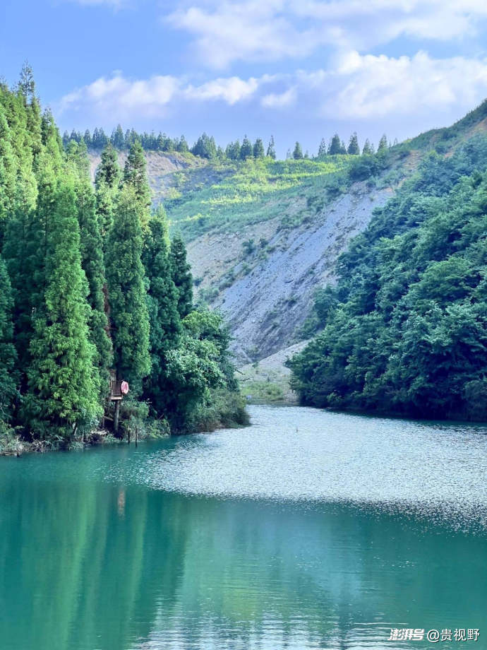 小藍(lán)湖露營(yíng)基地位于靛山村的山頂附近。羅格凼水庫(kù)(小藍(lán)湖)藏于密林深處,天氣晴好時(shí),湖水如被施魔法,呈現(xiàn)澄澈靛藍(lán)色像塊巨大寶石嵌入山林,周?chē)紭?shù)、綠植倒映其中。