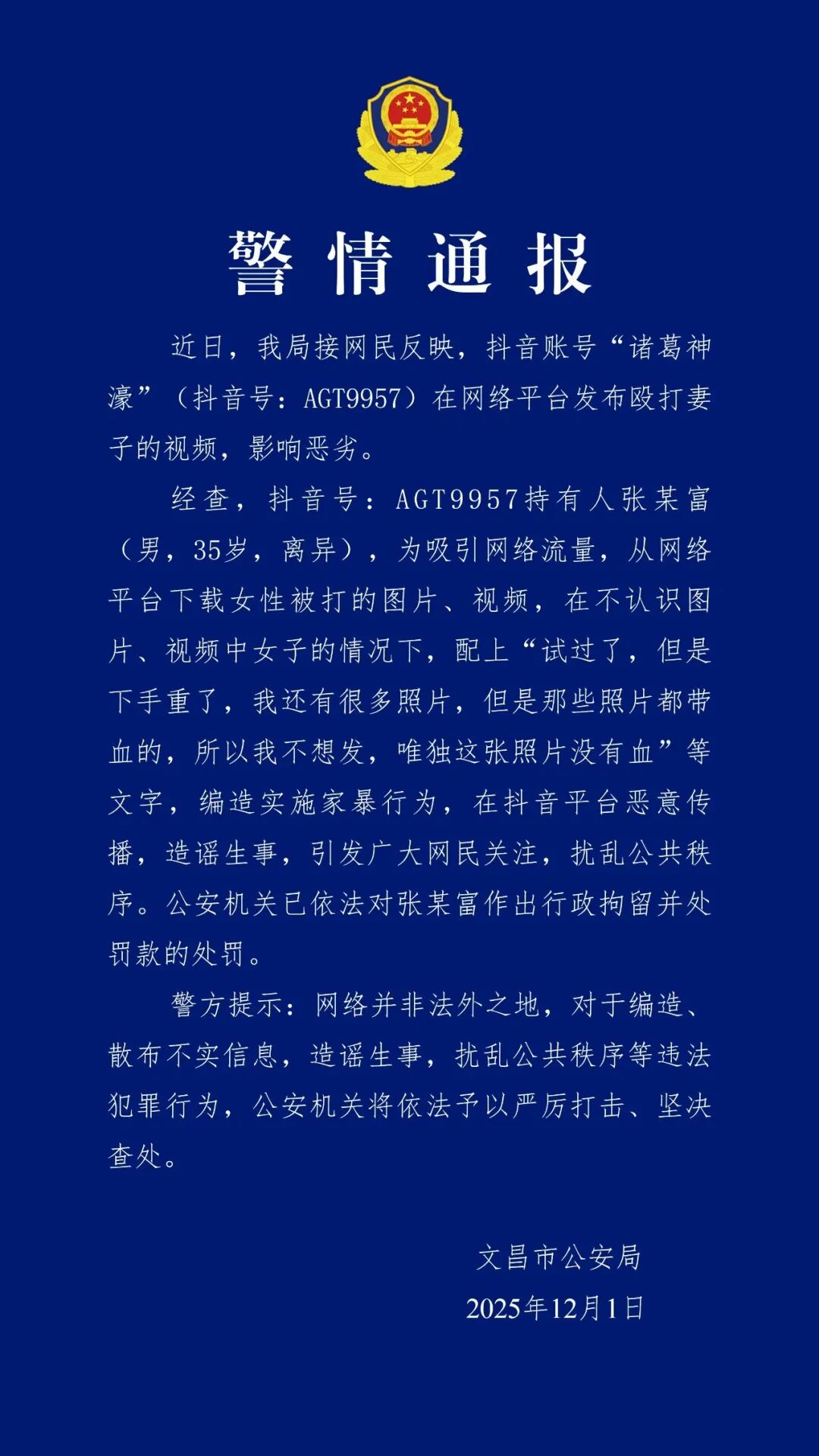 5.“諸葛神濠”,被行拘:12月1日,海南文昌市公安局發(fā)布“警情通報(bào)”稱,近日,文昌市公安局接網(wǎng)民反映,抖音賬號(hào)“諸葛神濠”(抖音號(hào):AGT9957)在網(wǎng)絡(luò)平臺(tái)發(fā)布?xì)蚱拮拥囊曨l,影響惡劣。經(jīng)查,抖音號(hào):AGT9957持有人張某富(男,35歲,離異),為吸引網(wǎng)絡(luò)流量,從網(wǎng)絡(luò)平臺(tái)下載女性被打的圖片、視頻,在不認(rèn)識(shí)圖片、視頻中女子的情況下,編造實(shí)施家暴行為,在抖音平臺(tái)惡意傳播,造謠生事,引發(fā)廣大網(wǎng)民關(guān)注,擾亂公共秩序。公安機(jī)關(guān)已依法對(duì)張某富作出行政拘留并處罰款的處罰。(檢察日?qǐng)?bào)正義網(wǎng))