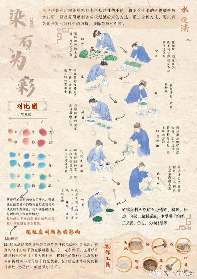 礦物顏料的制作過程融合了傳統(tǒng)工藝與技術(shù)智慧,從礦石的揀選、破碎、研磨,到通過水飛法進行精細分級,每一步都影響著顏料的最終品質(zhì)。顆粒粒徑的大小直接關(guān)系到顏料的光學(xué)行為,基于MIE散射理論的分析表明,顆粒度差異會導(dǎo)致色彩在明度、飽和度和視覺質(zhì)感上產(chǎn)生顯著變化,這也是礦物顏料具有獨特視覺魅力的科學(xué)原因。