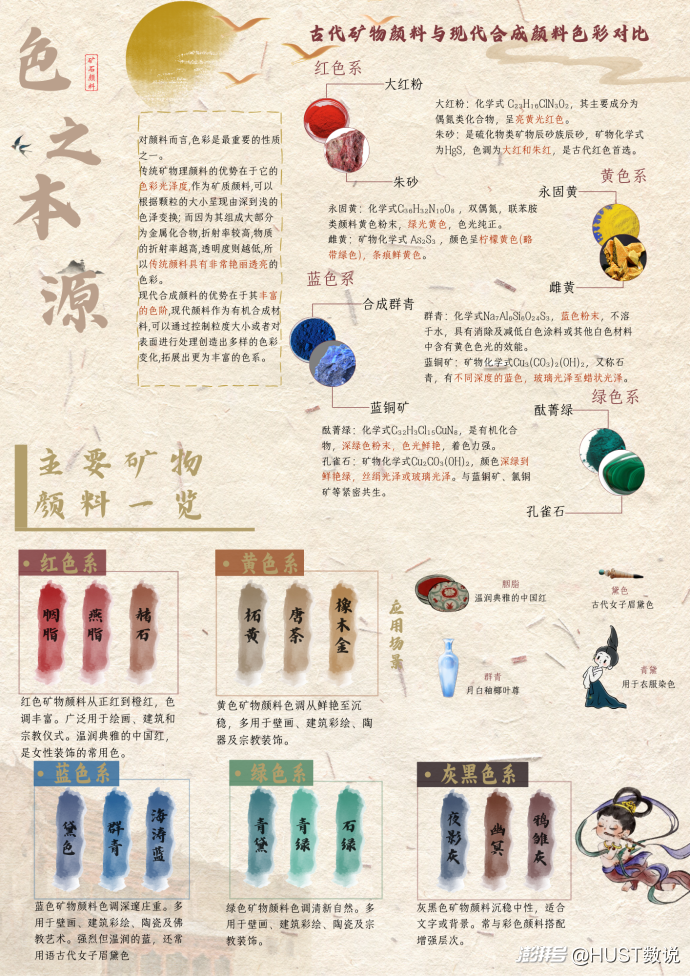 礦物顏料可按色系劃分為紅色系、黃色系、藍色系等多個類別,每一類顏色背后均有其特定的化學(xué)成分與物理結(jié)構(gòu)作為呈色基礎(chǔ)。與傳統(tǒng)礦物顏料相比,現(xiàn)代合成顏料在色域和制備效率上具有優(yōu)勢,但在耐光性、環(huán)保性與視覺質(zhì)感等方面,礦物顏料仍展現(xiàn)出獨特價值。