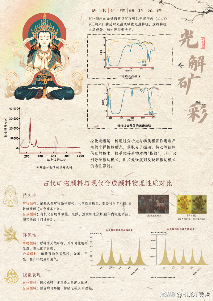 現(xiàn)代光譜技術(shù)為理解礦物顏料的呈色機制提供了新視角。通過分析不同礦物顏料的光譜曲線與拉曼光譜特征,可以科學(xué)闡釋其色彩形成的物理基礎(chǔ)。進一步將礦物顏料與現(xiàn)代合成顏料在持久性、環(huán)保性與視覺表現(xiàn)等方面進行比較,不僅揭示出傳統(tǒng)材料的獨特性能,也為文化遺產(chǎn)的科學(xué)保護與綠色材料的開發(fā)提供了借鑒。