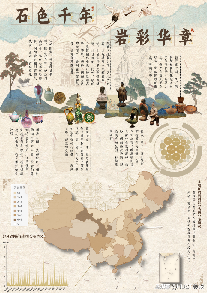 礦物顏料的歷史可追溯至新石器時代,早期彩陶上已出現(xiàn)礦物顏料的原始運用。隨著時間推移,其在漢唐壁畫中大放異彩,至宋元時期更在繪畫中展現(xiàn)出細膩豐富的表現(xiàn)力。從地域分布來看,中國多地均蘊藏獨特的礦物顏料資源,如朱砂、石青、石綠等,其中某些顏料種類分布廣泛,而部分省份因地質(zhì)條件優(yōu)越,成為顏料資源的重要富集區(qū),反映出礦物顏料在中國文化地圖上的多樣面貌。