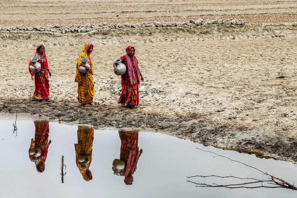 當?shù)貢r間2025年4月25日,孟加拉國庫爾納地區(qū),索拉村,婦女們提著水罐去取飲用水。視覺中國 圖