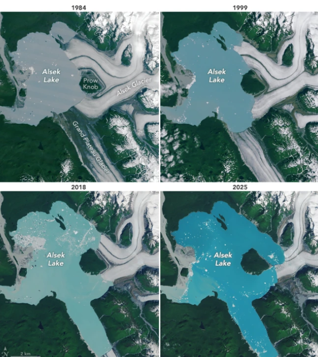 1984年與2025年的美國阿爾塞克冰川衛(wèi)星圖像對比。研究顯示,隨著阿爾塞克冰川消融,湖泊不斷擴大,如今環(huán)繞普羅山,以致形成新島。視覺中國 圖
