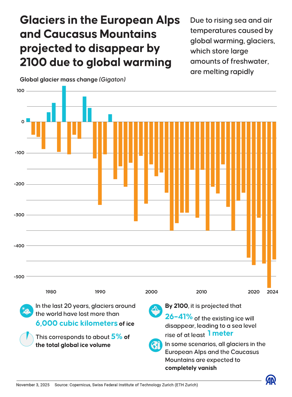 當?shù)貢r間2025年11月3日,圖表顯示:受全球變暖影響,預計至2100年歐洲阿爾卑斯山和高加索山脈冰川將完全消失。過去20年間,全球冰川已損失超過6000立方千米的冰體,這相當于全球冰川總冰量的約5%。預計到2100年,現(xiàn)有冰川的26%-41%將會消失,導致海平面上升至少1米。在某些情況下,歐洲阿爾卑斯山脈和高加索山脈的所有冰川預計將完全消失。信息 來源:哥白尼氣候變化服務、蘇黎世聯(lián)邦理工學院