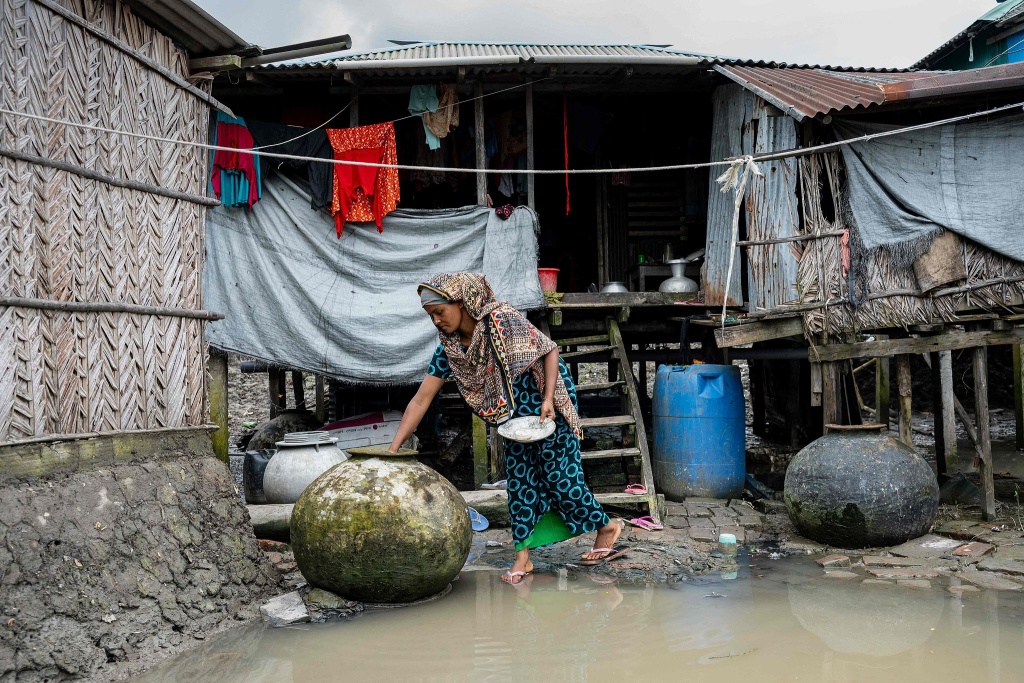 當?shù)貢r間2025年7月12日,孟加拉國庫爾納地區(qū),Jhulong Para村,一名婦女從收集雨水的瓦罐中取水。視覺中國 圖