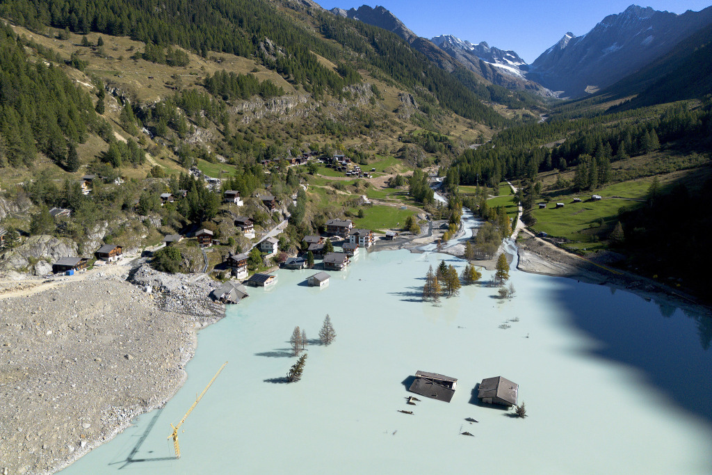當?shù)貢r間2025年9月19日,瑞士,無人機拍攝的布拉滕村。2025年5月28日,洛琛塔爾山谷的樺樹冰川部分融化崩塌引發(fā)山洪,將該村莊淹沒,并形成了一個大湖。視覺中國 圖