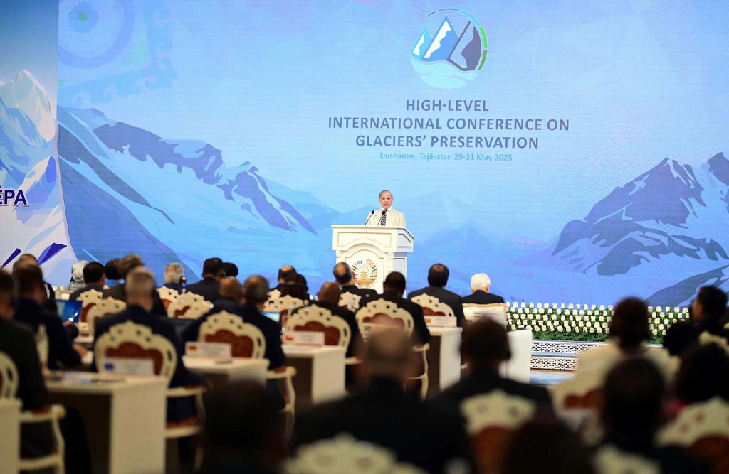 當?shù)貢r間2025年5月30日,塔吉克斯坦杜尚別,穆罕默德·謝巴茲·沙里夫首相在冰川保護國際高級會議(ICGP 2025)上發(fā)言。視覺中國 圖