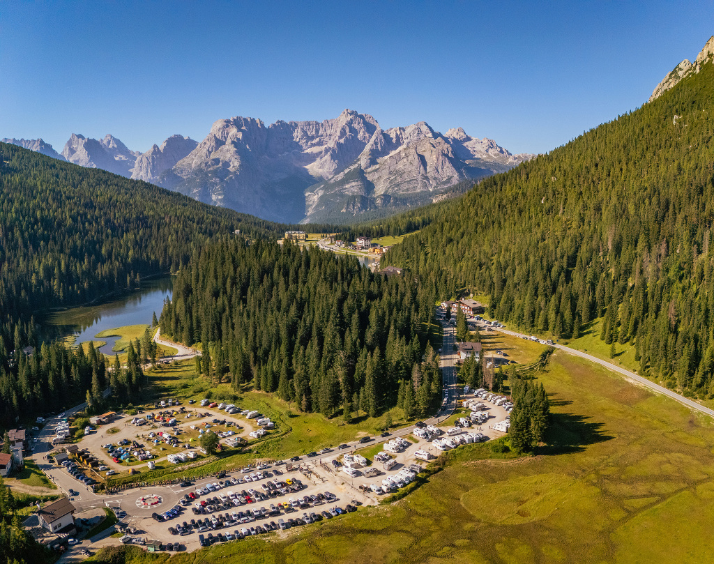 當?shù)貢r間2025年8月8日,意大利米蘇里納,拉瓦雷多三峰山班車停車場鳥瞰。旅游項目給這里帶來了經(jīng)濟效益,但也帶來了環(huán)境壓力:擁擠的小徑、停車混亂以及對脆弱生態(tài)系統(tǒng)的破壞。截至2025年夏季,當局推出限時入場許可證以及班車服務。這些措施旨在遏制擁堵,保護景觀。數(shù)據(jù)顯示,自1970年以來,這里的平均氣溫已升高1.5°C,積雪顯著減少。冰川消退,特別是馬爾莫拉達冰川的消退,已達到驚人水平。視覺中國 圖
