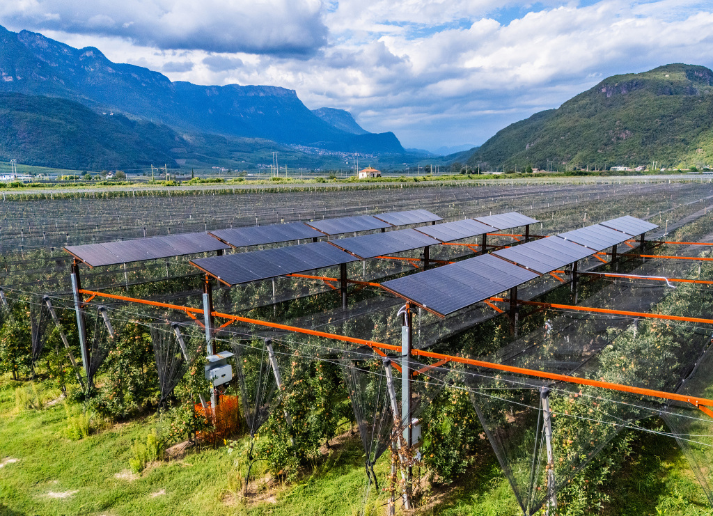 當?shù)貢r間2025年9月1日,意大利博爾扎諾奧拉,農光互補電站的鳥瞰圖。農光互補系統(tǒng)將可持續(xù)性與創(chuàng)新相結合:在3000平方米的蘋果樹行上方近5米處架設了70千瓦的太陽能電池板,這些電池板安裝在堅固的耐候鋼太陽能跟蹤器上,為大約20個家庭提供能源,同時傳感器網(wǎng)絡監(jiān)測氣候、太陽輻射、反照率、土壤濕度和作物響應。視覺中國 圖
