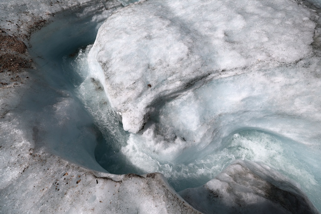 當?shù)貢r間2025年8月11日,德國加米施-帕滕基興,楚格峰的施尼費爾納冰川,冰雪融化形成水流。專家表示,預計將在一兩年內失去冰川的部分特征,并將在2030年左右完全消失。視覺中國 圖