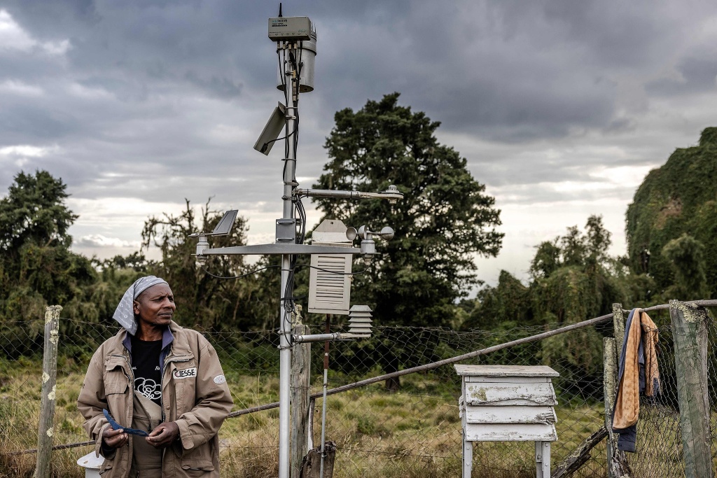當?shù)貢r間2025年3月5日,山地巡護員彼得·恩德瓜(Peter Ndegua)在肯尼亞山國家公園內的氣象站檢查收集氣候和氣象數(shù)據(jù)的設備??夏醽喩缴媳ㄑ杆傧?,這些冰川的變化影響著數(shù)百萬人的水源,當?shù)剞r業(yè)、水力發(fā)電和生物多樣性。視覺中國 圖