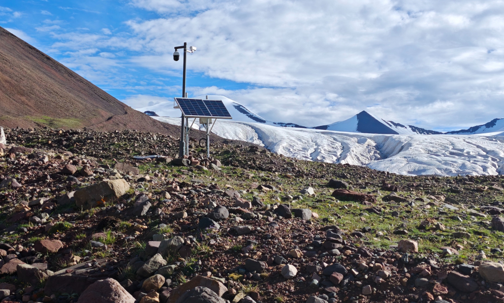 2025年8月1日,冬克瑪?shù)妆ㄅ栽O立的持續(xù)觀測冰川末端變化的攝像頭。新華社記者 邱婧熠 攝