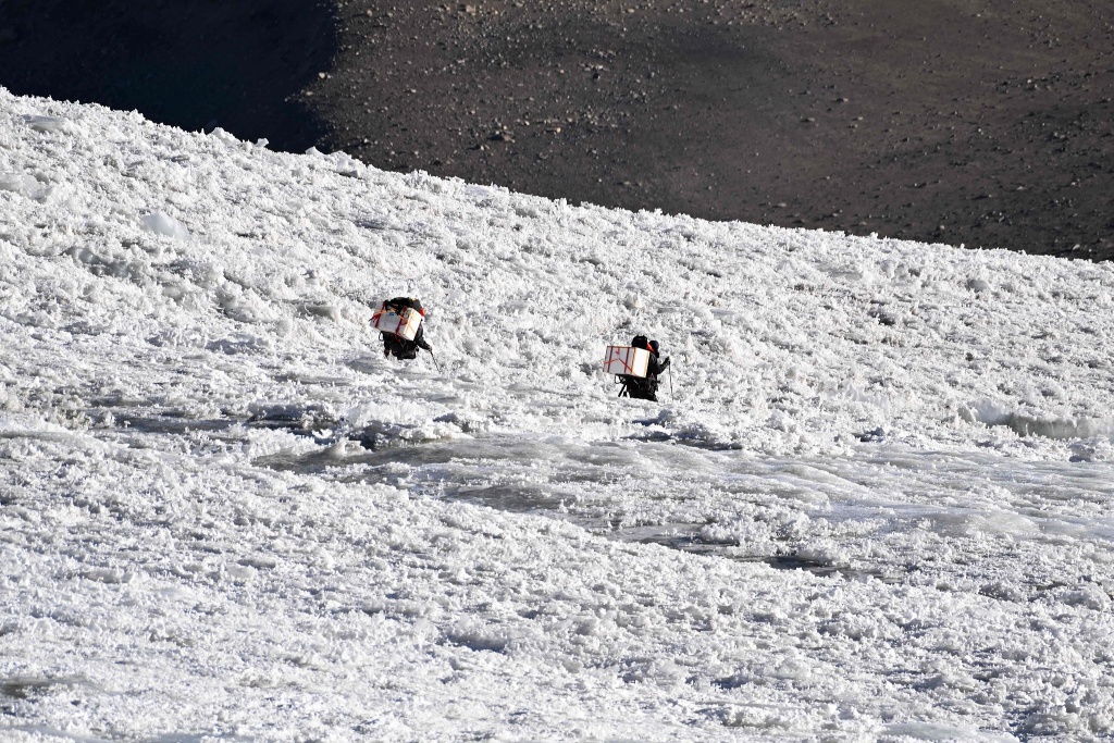 當?shù)貢r間2025年9月24日,塔吉克斯坦東部的帕米爾冰川,兩名科考隊成員攜帶冰芯樣本下山前往大本營??茖W家團隊在帕米爾冰川深處鉆探,以提取該地區(qū)首批深層冰芯,旨在將全球變暖抹去地球氣候記憶之前將其保存下來。視覺中國 圖