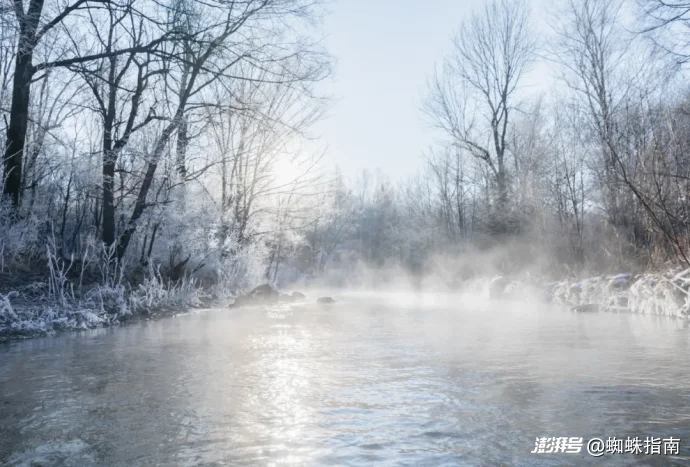 大雪過(guò)后,這里的林海雪原美得那么干凈、純粹,茫茫雪原里點(diǎn)綴的村莊,村莊旁湍急的河流上飄起了晨霧,都充滿了童話感,森林深處的小木屋,透出橘黃色的暖光,有一種云上生活的錯(cuò)覺(jué)。