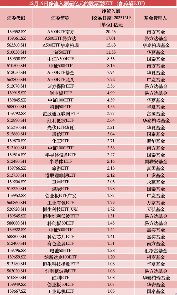 具體產(chǎn)品方面,12月19日凈流入額前三的均為A500ETF:南方中證A500ETF、易方達(dá)中證A500ETF、華泰柏瑞中證A500ETF分別獲凈流入20.43億元、17.01億元和15.68億元。緊隨其后的華夏上證50ETF、國(guó)泰中證A500ETF、南方中證A500ETF、華夏中證A500ETF、廣發(fā)中證A500ETF單日凈流入均超過(guò)5億元。