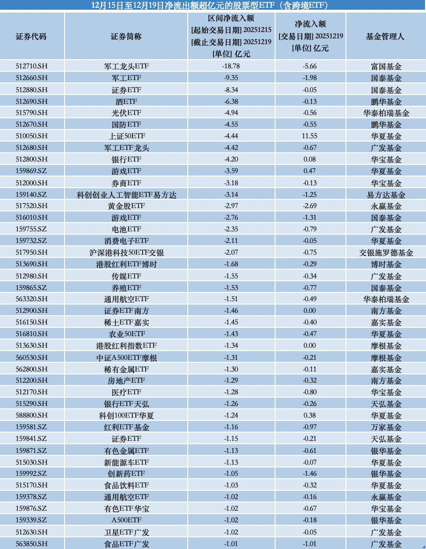 另從資金流出端觀(guān)察,軍工板塊是上周ETF資金撤離的主要方向。其中,富國(guó)軍工龍頭ETF單周凈流出18.78億元,國(guó)泰軍工ETF凈流出9.35億元,鵬華國(guó)防ETF、廣發(fā)軍工龍頭ETF也分別流出4.55億元和4.42億元。