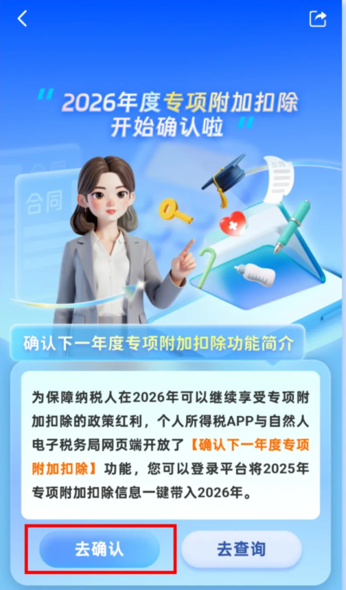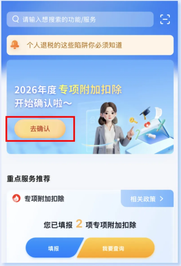 在首頁“2026年度專項(xiàng)附加扣除開始確認(rèn)啦~”模塊,點(diǎn)擊去確認(rèn);