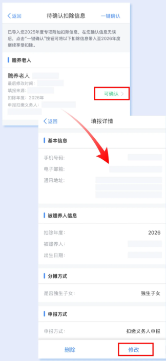 如您需要對專項(xiàng)附加扣除進(jìn)行修改、作廢等操作,可以在專項(xiàng)附加扣除信息確認(rèn)界面,點(diǎn)擊可確認(rèn)進(jìn)行相關(guān)操作。