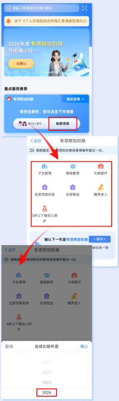 如您是第一次填報(bào)專項(xiàng)附加扣除,或需要對專項(xiàng)附加扣除進(jìn)行新增操作,只需要登錄首頁在重點(diǎn)服務(wù)推薦模塊點(diǎn)擊我要填報(bào)或填報(bào),選擇要填報(bào)的專項(xiàng)附加扣除項(xiàng)目,選擇扣除年度2026,再將相關(guān)信息錄入即可。