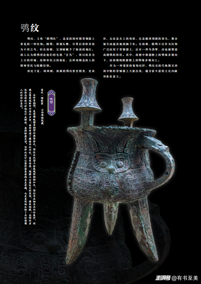 鴟鸮其實(shí)就是貓頭鷹。商朝人認(rèn)為鴟鸮是自己的祖先“玄鳥”,所以鴟鸮紋也象征著祥瑞、戰(zhàn)神和權(quán)力。
