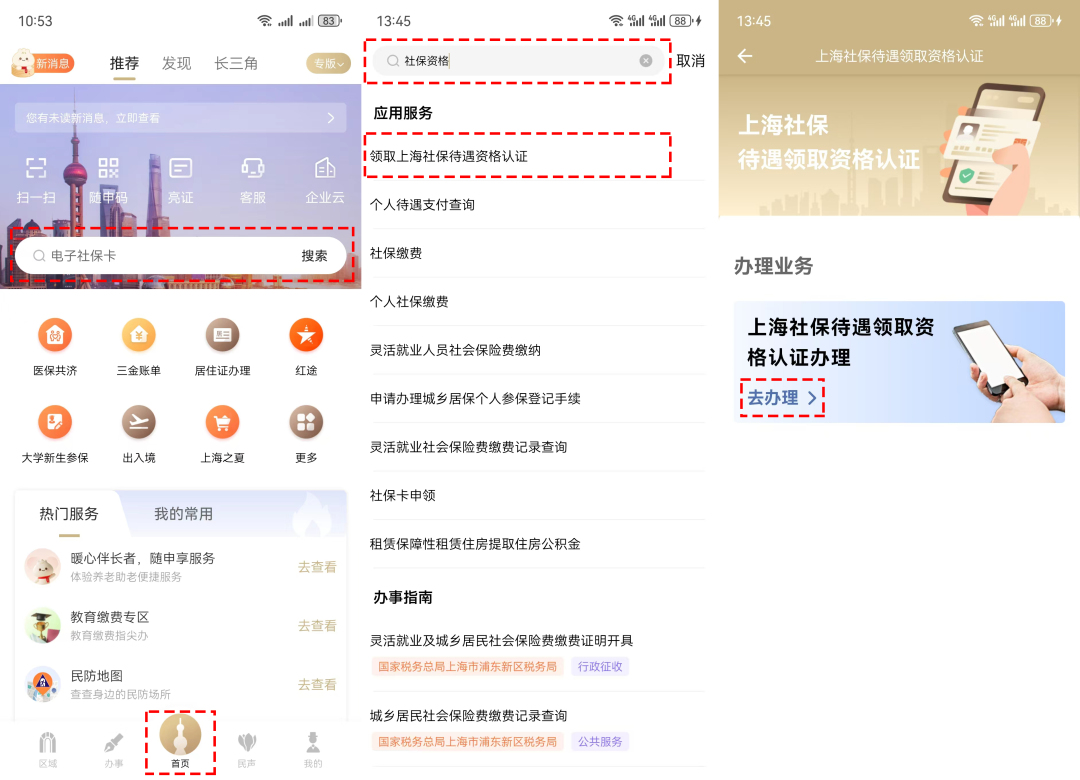 登錄“隨申辦市民云”APP→首頁搜索關(guān)鍵字“社保資格”→點(diǎn)擊“領(lǐng)取上海社保待遇領(lǐng)取資格認(rèn)證”→點(diǎn)擊“去辦理”,進(jìn)入認(rèn)證流程。