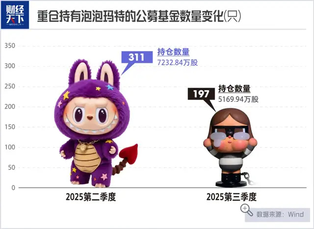 Wind數(shù)據(jù)顯示,今年第二季度,持有泡泡瑪特的公募基金數(shù)量達(dá)到峰值的311只,持倉數(shù)量達(dá)7232.84萬股;到了泡泡瑪特股價(jià)轉(zhuǎn)頭朝下的第三季度,重倉基金數(shù)量大幅減少至197只,持倉數(shù)量也減少至5169.94萬股。據(jù)此測算,泡泡瑪特在一個(gè)季度之內(nèi),就被基金拋售了2062.9萬股,持倉比例下降了28.52%。