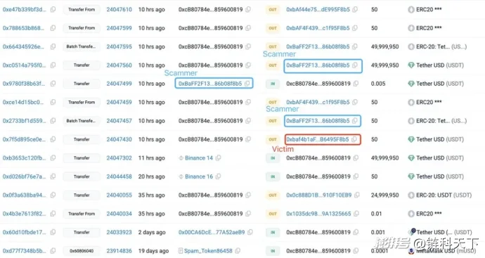 王純之所以會(huì)發(fā)表這番言論,起因是他在評(píng)論另一樁更為慘烈的黑客事件。就在幾天前,一位交易員遭遇了精心策劃的“地址投毒攻擊”(Address Poisoning Attack),在短短半小時(shí)內(nèi),近5000萬(wàn)美元的USDT資產(chǎn)不翼而飛。