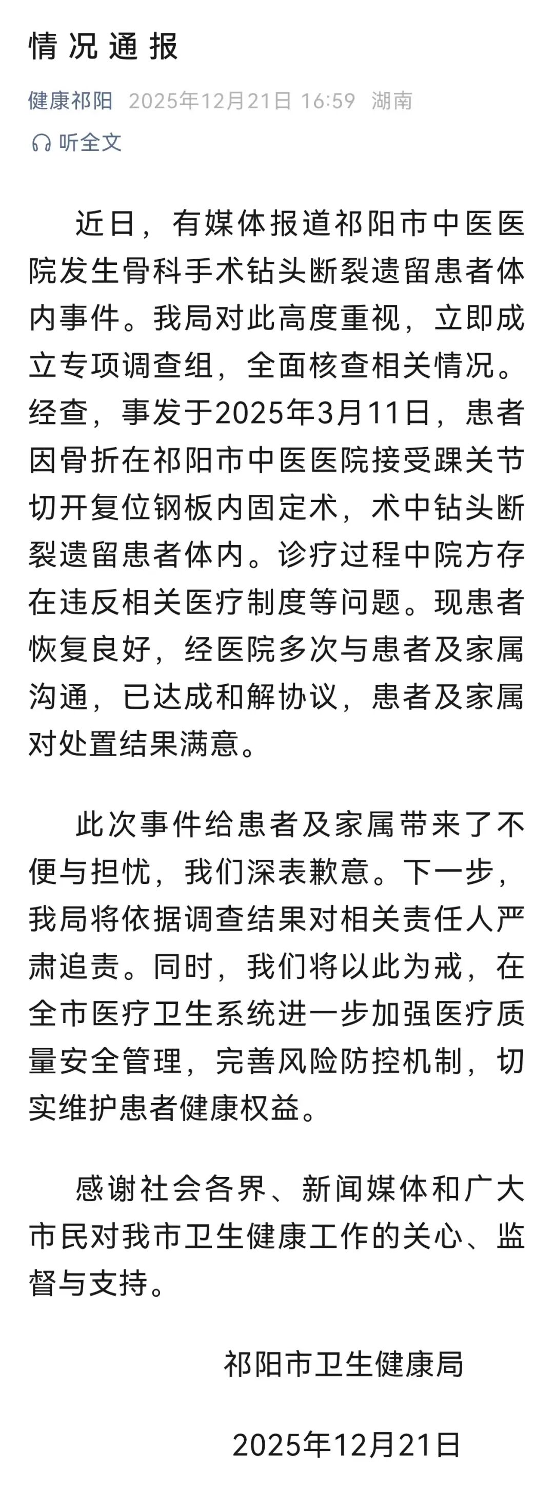 12月21日,湖南祁陽市衛(wèi)生健康局就“手術(shù)鉆頭斷裂遺留患者體內(nèi)”一事發(fā)布情況通報。詳情如下↓(人民網(wǎng))▼▼▼