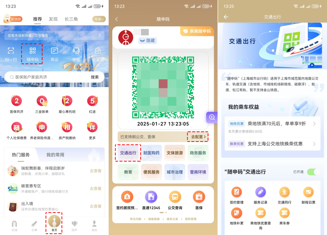 市民乘客只需開通“隨申辦市民云”APP“隨申碼”的“交通”應(yīng)用場景功能,展示“隨申碼”(綠碼頁面)即可在本市全線軌道交通(含磁懸浮)、地面公交、輪渡(含三島客運)等公共交通工具上實現(xiàn)“刷碼”通行,并享受公交與軌道交通間換乘優(yōu)惠、購買“聯(lián)程日票”、攜帶至多2名同行人刷碼乘車等更多乘車權(quán)益,體驗便捷、高效、優(yōu)惠的出行方式。