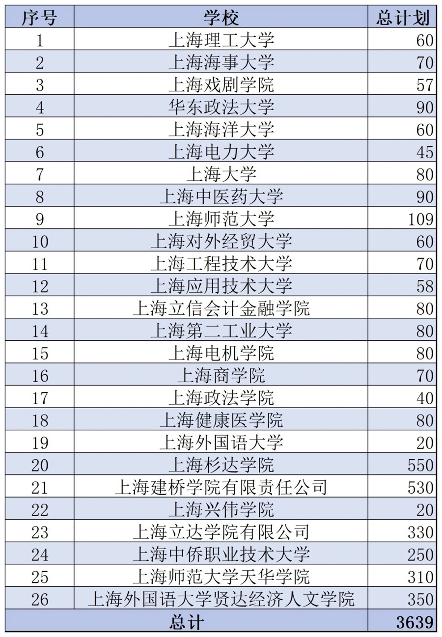 2026年上海26所春考院校計劃招生共3639人。
