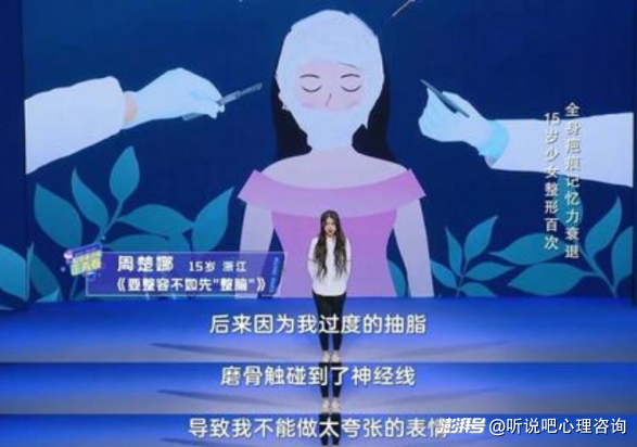 在綜藝《超級演說家正青春》中,網(wǎng)紅女孩周楚娜在演說中提到,15歲的自己,已經(jīng)整容數(shù)百次,花費400萬。