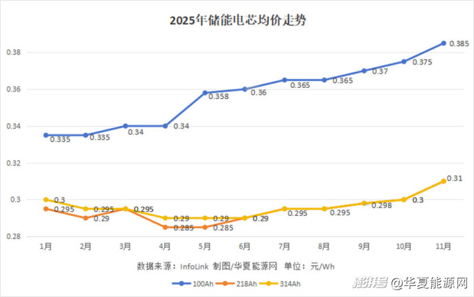 電芯環(huán)節(jié)處在材料環(huán)節(jié)的下游,也很早就開(kāi)啟了上漲行情。InfoLink數(shù)據(jù)顯示,280Ah及314Ah儲(chǔ)能電芯的均價(jià),在5月觸底后,6月小幅回升至0.29元/Wh,此后一路上行,10月站穩(wěn)0.3元/Wh,截至11月20日,均價(jià)已升至0.31元/Wh。此外,100Ah儲(chǔ)能電芯均價(jià)也出現(xiàn)了明顯的上漲。
