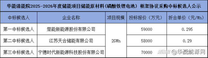 華夏能源網(wǎng)注意到,12月10日,中國(guó)華能公布了華能清能院2025-2026年度儲(chǔ)能框采候選人結(jié)果。其中,1GW/2GWh儲(chǔ)能電池框采,要求單體電池容量不低于314Ah。最終,楚能新能源、天合儲(chǔ)能、寧德時(shí)代(SZ:300750)三家企業(yè)入圍,報(bào)價(jià)分別為0.295元/Wh、0.29元/Wh、和0.35元/Wh,前兩名的報(bào)價(jià)均處于電芯價(jià)格年內(nèi)低點(diǎn)。