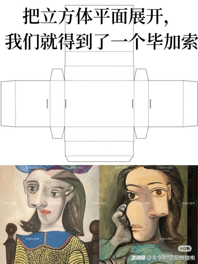 上面圖片的上部,就是一個日常見到的紙盒的全部展開的樣子。而畢加索,畫的就是人、物的多個面展開后的平面。因為你在‘此時’看到一個人的右側(cè)臉時,并不能同時看到左側(cè)臉;畢加索的畫法,在‘同時’的概念下,展現(xiàn)了右臉和左臉。