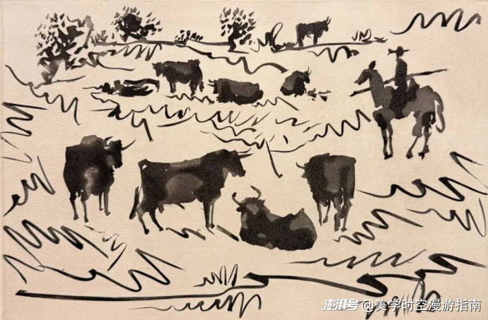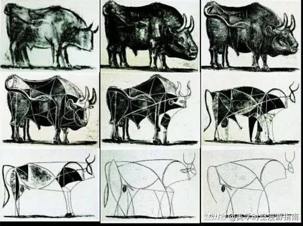 《?!肥钱吋铀饔?945-1946年創(chuàng)作的石版畫系列作品,通過逐步簡化公牛形象展現(xiàn)從具象到抽象的藝術(shù)演變過程。 他用立體主義解構(gòu)手法,最終僅用12條線條勾勒出公牛的本質(zhì)形態(tài),成為現(xiàn)代藝術(shù)'減法創(chuàng)作'的典范。