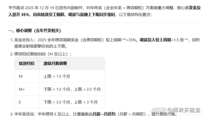 字節(jié)也宣布2025年獎(jiǎng)金投入提升35%,調(diào)薪投入上漲1.5倍,提高所有職級(jí)薪酬總包的下限(起薪)和上限(天花板)。