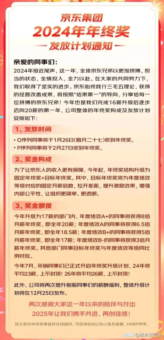 京東發(fā)布2025年終獎(jiǎng)公告,集團(tuán)92%的員工拿滿甚至拿到超額年終獎(jiǎng),年終獎(jiǎng)總投入同比增幅超過(guò)70%,京東采銷更是“上不封頂”。