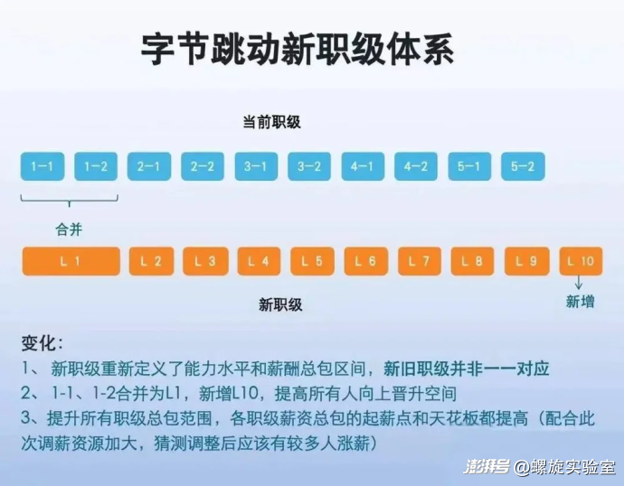 近期宣布全員漲薪的字節(jié),也將原有的5級(jí)10檔職級(jí)體系擴(kuò)展為10級(jí)體系,希望能夠解決“人才通脹”,為員工提供了更廣闊的漲薪空間。