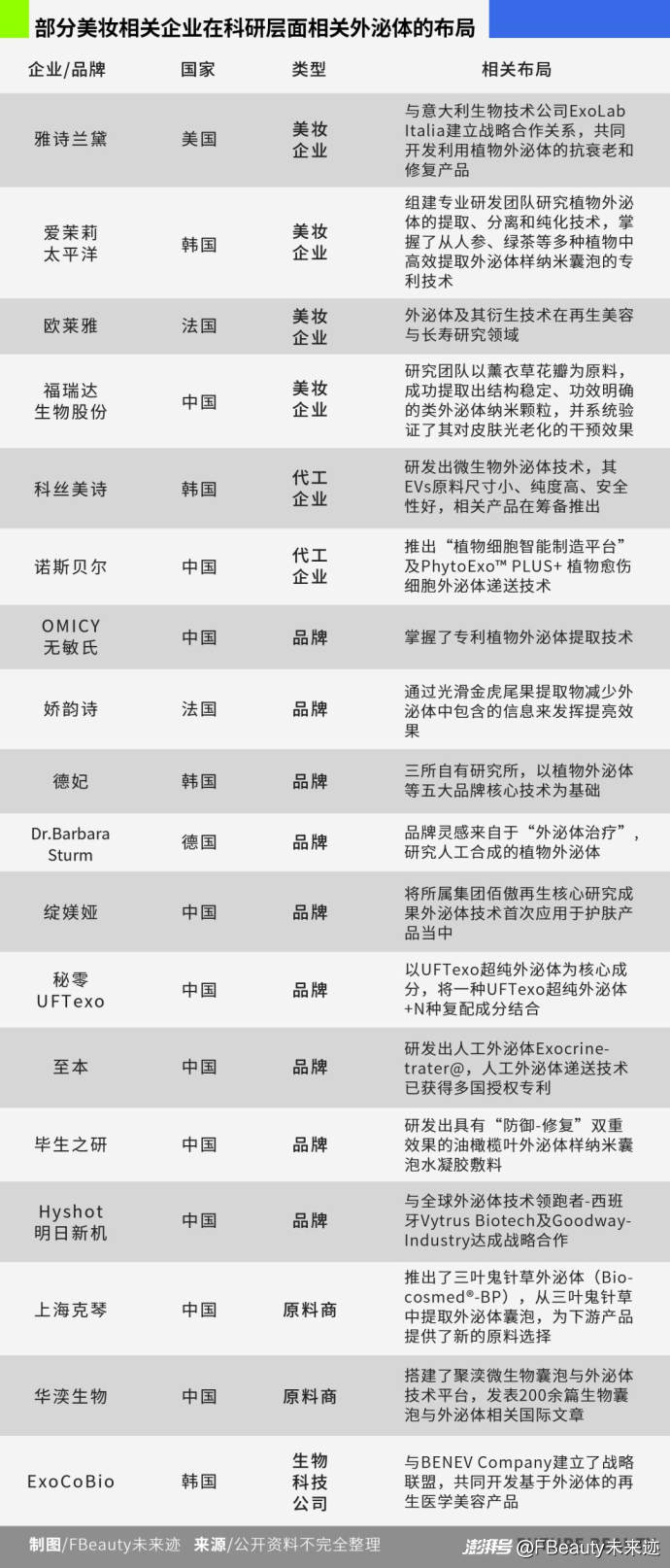 《FBeauty未來(lái)跡》整理發(fā)現(xiàn),至少已有超17家美妝相關(guān)企業(yè)參與到外泌體的相關(guān)布局當(dāng)中。其中包括雅詩(shī)蘭黛、歐萊雅、愛茉莉太平洋等美妝巨頭,以及科絲美詩(shī)、諾斯貝爾等頭部代工企業(yè),嬌韻詩(shī)、綻媄婭等美妝品牌,以及上??饲俚仍仙?。