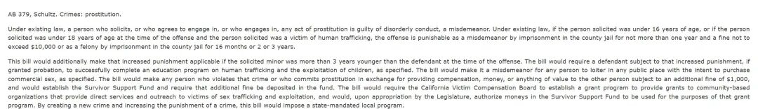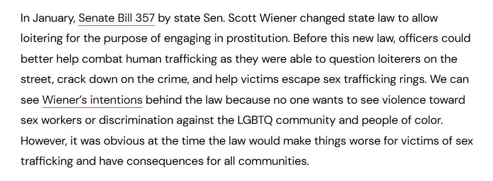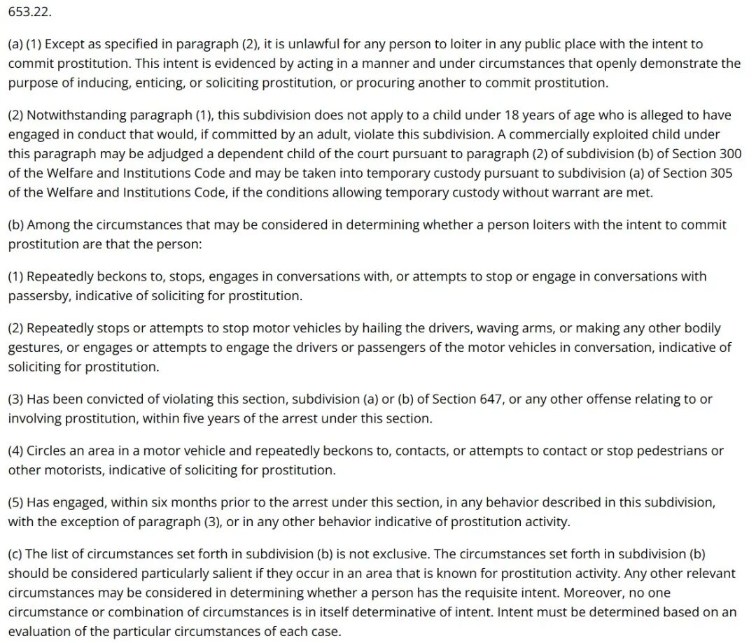 加州曾于2022年通過(guò)一項(xiàng)《全民安全街道法案》,廢除了“執(zhí)法者可通過(guò)行為或穿著來(lái)判斷當(dāng)事人是否賣(mài)淫而進(jìn)行逮捕”的法律條文,對(duì)當(dāng)?shù)亟謪^(qū)造成了不良影響,但該法案并不代表賣(mài)淫或兒童賣(mài)淫合法化。