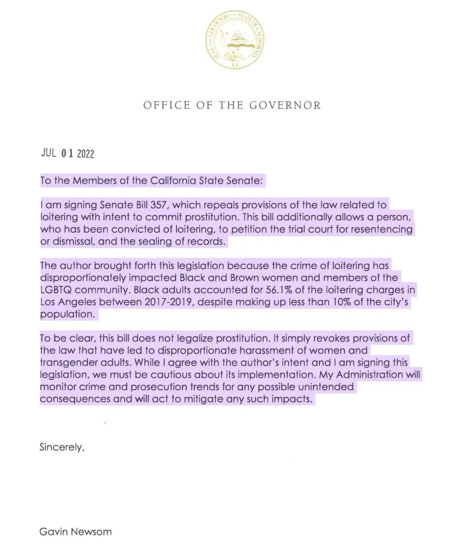 《全民安全街道法案》(SB 357)法案提出者Scott Wiener認(rèn)為游蕩罪對(duì)黑人、棕色人種女性以及LGBTQ群體造成了格外嚴(yán)重的影響,可能使相關(guān)人士遭到莫須有的刑法指控。2022年加州州長(zhǎng)的簽署聲明稱(chēng),“需要明確的是,這項(xiàng)法案并未使賣(mài)淫行為合法化。它只是廢止了導(dǎo)致對(duì)女性及跨性別成年人過(guò)度騷擾的相關(guān)法律條款。雖然我(Gavin Newsom)認(rèn)同提案者的意圖,并且我也將簽署這項(xiàng)立法,但我們必須謹(jǐn)慎對(duì)待其實(shí)施過(guò)程?!?/p>