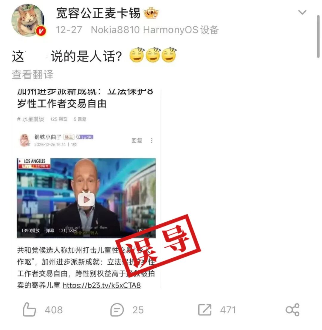 近期,有網(wǎng)友在社交平臺(tái)發(fā)布圖片并稱(chēng),“加州進(jìn)步派新成就:立法保護(hù)8歲性工作者交易自由,跨性別權(quán)益高于被拍賣(mài)的寄養(yǎng)兒童?!?/p>