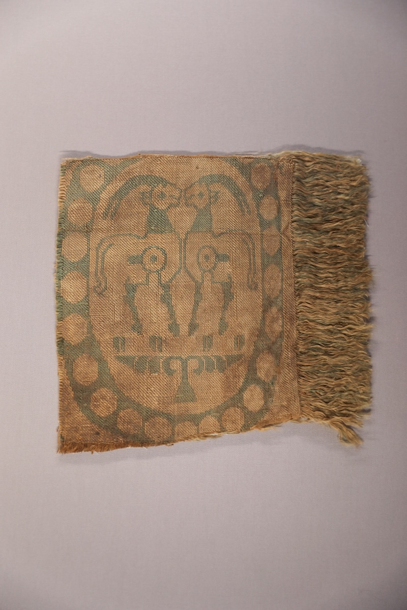 團(tuán)窠聯(lián)珠對(duì)羊紋錦殘片,唐代,中國絲綢博物館藏