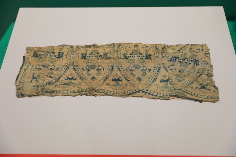 北朝聯(lián)珠交波人物獸紋錦,呈現(xiàn)規(guī)則紋樣。底為黃色平紋面料,圖案為靛青色,由聯(lián)珠紋、人物和動(dòng)物紋組合而成。聯(lián)珠紋在中國盛行于魏晉南北朝及隋唐時(shí)期,一般認(rèn)為其源頭在西亞,被認(rèn)為是西域文化對(duì)絲綢圖案最大的影響。