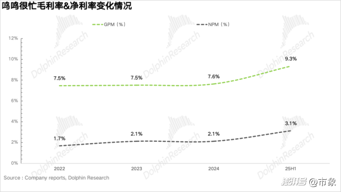 過去三年(2022年-2024年),鳴鳴很忙的毛利率穩(wěn)定在7.6%左右,并于2025年上半年提升至9.3%。