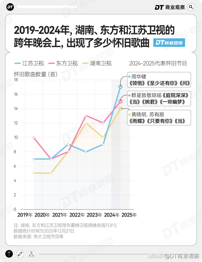 《DT商業(yè)觀(guān)察》統(tǒng)計(jì)了湖南衛(wèi)視、東方衛(wèi)視和江蘇衛(wèi)視(這三個(gè)衛(wèi)視的收視率常年霸榜衛(wèi)視跨晚TOP3)2019年-2024年的跨晚節(jié)目單,數(shù)據(jù)顯示,“懷舊歌曲”的數(shù)量在最近5年飛速增長(zhǎng),并在去年達(dá)到了頂峰。
