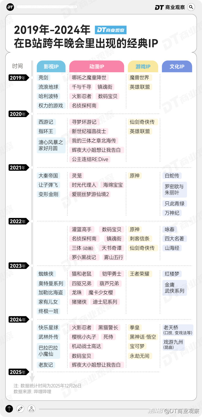 我們統(tǒng)計(jì)了2019年到2024年B站跨晚出現(xiàn)的經(jīng)典IP,發(fā)現(xiàn)從第一屆跨年晚會(huì)開(kāi)始,經(jīng)典IP就是B站跨晚的重要組成部分,2019年就有12個(gè)經(jīng)典IP,橫跨影視、動(dòng)漫和游戲三大領(lǐng)域。