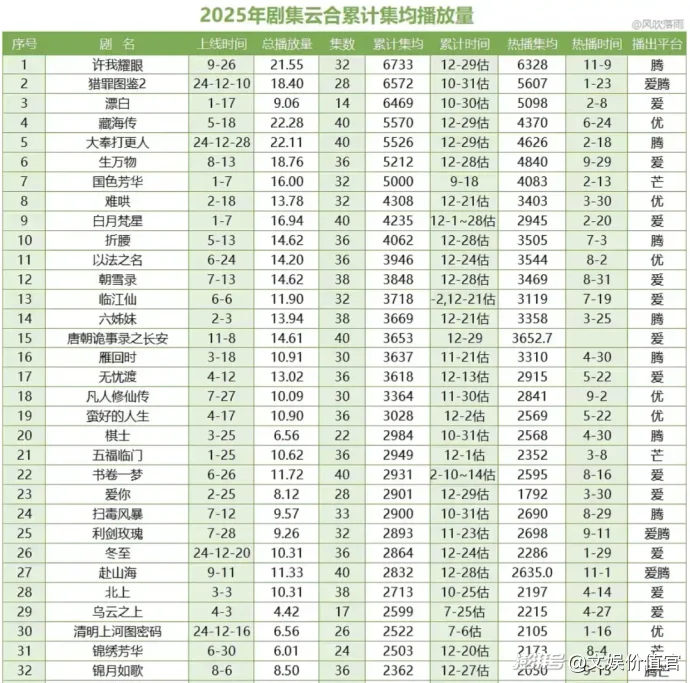 首先,讓我們通過2025年熱播劇集的整體表現(xiàn),宏觀縱覽一下今年長劇市場的景氣程度。雖然云合數(shù)據(jù)的年度報告尚未出爐,但豆瓣“收視率研究中心”小組的“數(shù)據(jù)專家”,已經(jīng)根據(jù)日常的追蹤計算,排定了各平臺劇集的年終座次。